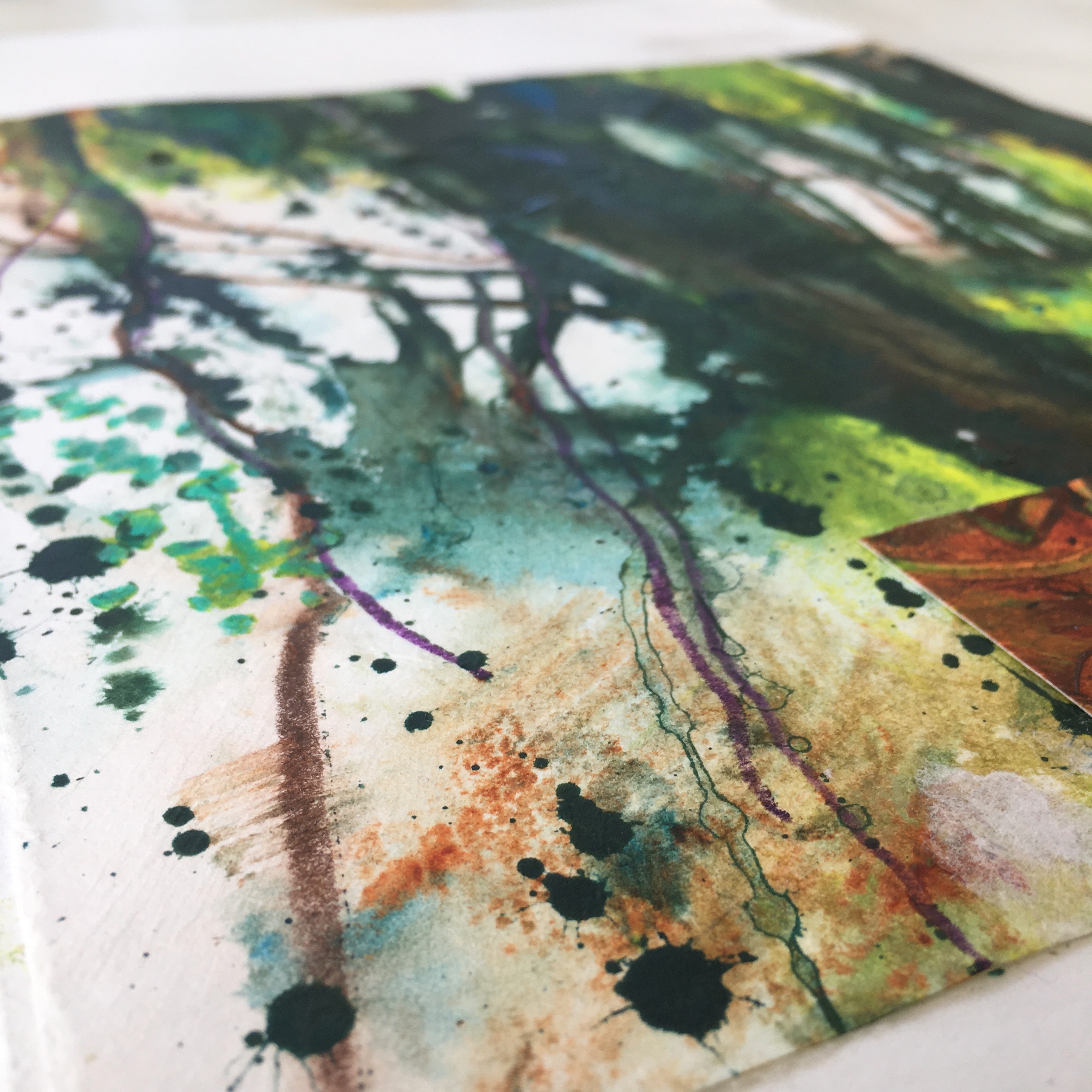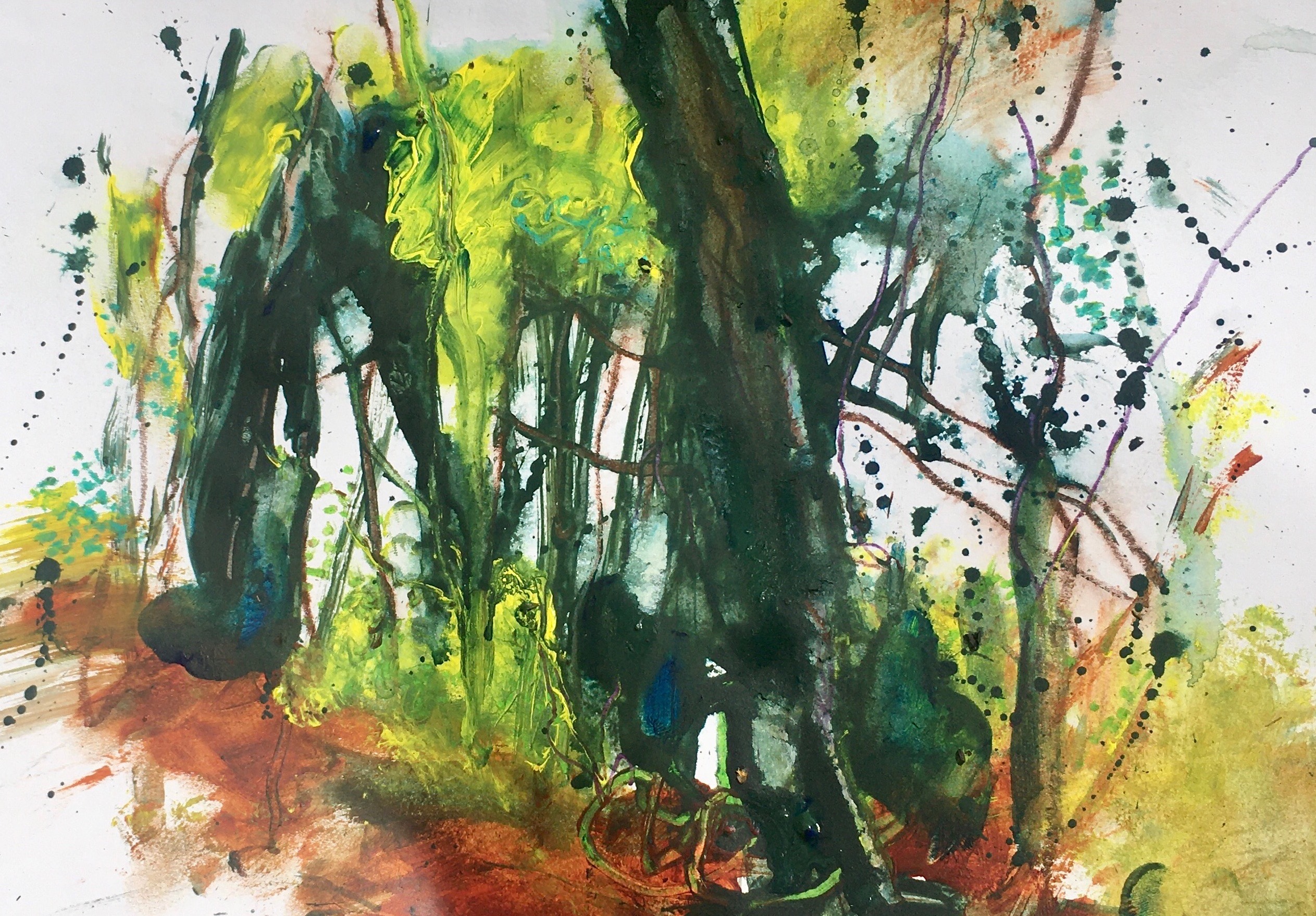 Charcoal, white chalk, plastic and putty rubbers, ink, pencils, watercolour pencils (just a couple, I use Inktense and always use dark indigo, plus perhaps one other), woodies (just a couple of colours), white and black/dark paint plus one or two colours (acrylic, gouache or watercolour: I will be using acrylic/gouache), a mix of papers for use in collage including some patterned paper, brushes (a range of sizes from rigger to 3 inches), mark making tools: palette knife, bamboo pen, sticks, old credit card or bone folder, water spray. Gesso for the collage background (optional), a small pocket concertina sketchbook (seawhite or similar), cartridge paper, tape, Glue stick/pva.